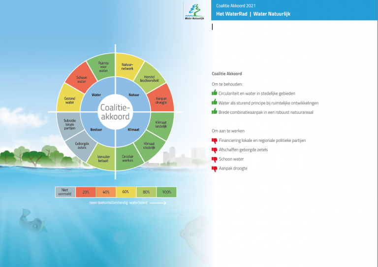 Op de doelen voor het thema klimaat scoort het coalitieakkoord erg hoog. Water Natuurlijk is ook tevreden dat de coalitie aandacht heeft voor water als ordenend principe bij ruimtelijke ontwikkelingen. Verder scoort het coalitieakkoord goed op klimaatadaptatie zowel in de stad als in het ommeland, is er aandacht voor circulariteit en het principe dat de vervuiler betaalt.