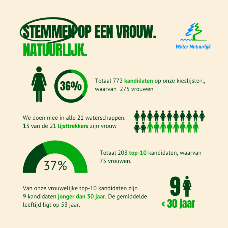 Water Natuurlijk heeft bij de komende verkiezingen voor de waterschappen de meeste vrouwelijke lijsttrekkers van alle partijen. Van de 21 waterschappen worden er bij Water Natuurlijk 13 lijsttrekkers vervuld door vrouwen. Water Natuurlijk maakt zich naast genderdiversiteit ook hard voor leeftijdsdiversiteit. In de top 10 kandidaten van Water Natuurlijk zijn maar liefst 9 vrouwelijke kandidaten onder de 30 jaar oud.