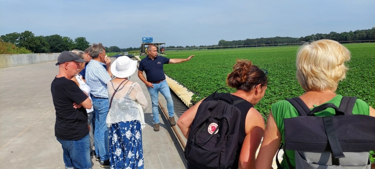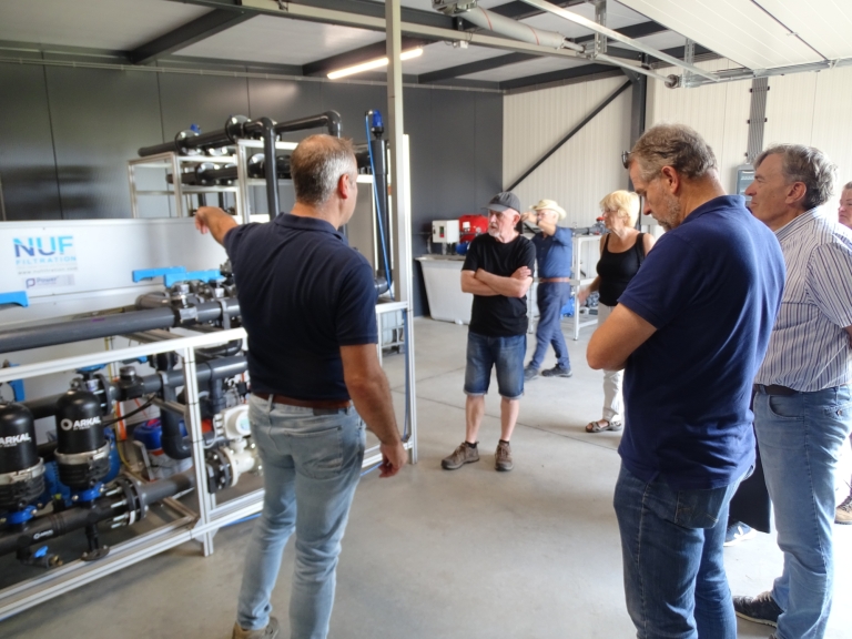 Naast het Markdal hebben we ook een bezoek gebracht aan aardbeiplant kwekerij Frank van Alphen. Hier heeft Frank ons laten zien en meegenomen in de ontwikkeling van een geheel gesloten watersysteem om de planten te beregenen en tevens opvang regenwater, zodat er geen water met eventuele meststoffen etc. in bodem of aangrenzende Mark verdwijnt. Hier is een mooi voorbeeld dat niet alleen in kassen, maar ook in de openlucht een gesloten systeem mogelijk is. Met een mooi en innovatief zuiveringssysteem wordt water opgevangen, gereinigd en weer klaar gemaakt voor beregening van de stekken en planten, overtollig water en nieuw regenwater wordt direct weer opgevangen gefilterd en voor hergebruik opgeslagen. Een trotse kweker heeft ons laten zien dat samen we de landbouw op een goede wijze mogelijk is, zonder vervuiling van bodem en oppervlakte water en hoe in plaats van oppompen, opvang en hergebruik van (regen)water mee helpt aan een goed beheersbaar watersysteem. Dit helpt ons bij het halen van KRW doelen.