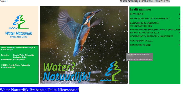 Water Natuurlijk Brabantse Delta is begonnen met het verspreiden van een nieuwsbrief naar alle leden van water natuurlijk in het gebied Brabantse Delta. In de nieuwsbrief treft u een terugblik op de inzet van onze fractie aan, vergaderdata, nieuwtjes zowel vanuit fractie als vanuit de vereniging het gebied Brabantse Delta betreffende etc. WE gaan deze nieuwsbrief een aantal keren per jaar gekoppeld aan de cyclus van de vergaderingen van het Algemeen Bestuur verzenden naar alle leden in ons gebied. Ook geïnteresseerden niet leden die ons graag willen volgen en belangstellende die graag ons volgen met doel om lid te worden kunnen de nieuwsbrief ontvangen. Stuur een bericht naar info.waternatuurlijk.bd@gmail.com en wij zetten u op de verzendlijst.