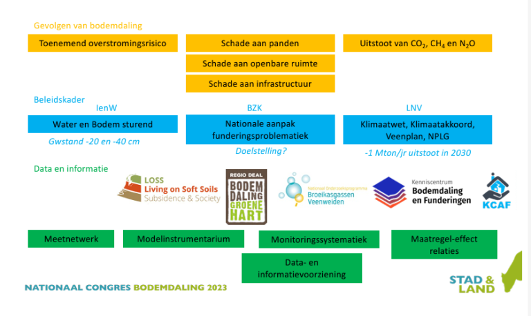 In vervolg op eerdere congressen, is het de erkenning van het probleem van bodemdalng nu wel breed verspreid. Miljoenen mensen hebben er mee te maken. Er zijn tal van programma's opgezet, vele initiatieven zijn van start gegaan, allerlei maatregelen zitten in de pijplijn - maar wat mist is coördinatie. Hoe krijg je samenhang tussen de lange termijn van werken met het natuurlijke water- en bodemsysteem en coördinatie van de verschillende thema's die samenhangen. Daarom werd in zowel de plenaire als de subsessies die ik bezocht, deze sheet vertoond.