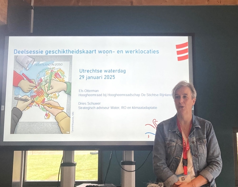 Naast het plenaire deel waren er diverse zeer interessante deelsessies, zoals over de watergeschiktheidskaart voor woningbouwlocaties. Onze eigen hoogheemraad Els Otterman, portefeuillehouder ruimtelijke ordening, was de gespreksleider hierbij. De kaart is ontwikkeld door de waterschappen Amstel, Gooi en Vecht, Rivierenland, Vallei en Veluwe en Hoogheemraadschap De Stichtse Rijnlanden, drinkwaterbedrijven Oasen, Vitens en Waternet en Rijkswaterstaat Midden-Nederland. Waar kan wel en waar kan niet worden gebouwd vanwege de water-en-bodemstructuur? Hoe voorkomen we dat de kosten voor zowel de huiseigenaar als de ingezetenen van het waterschap de pan uitrijzen in de toekomst? Wat zou een ontwikkelaar of gemeente op zijn minst moeten doen als er dan toch gebouwd zou moeten worden?