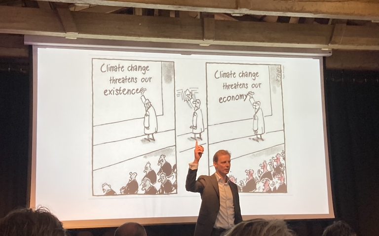 Maar het ging niet over het verleden en over de Oude Hollandse Waterlinie tijdens de Water- en Klimaatconferentie. In het plenaire gedeelte sprak onder meer Detmer Koekoek (zie foto), kwartiermaker NL AAA Klimaatbestendig. NL AAA Klimaatbestendig is een publiek-private coalitie van overheidsorganen, de financiële sector, bedrijven en de wetenschap. Met een AAA-rating wordt de meest betrouwbare financiële instelling of overheid aangeduid. Het doel van dit onderdeel van het Deltaprogramma is om Nederland veilig en welvarend te houden en weerbaar te maken tegen klimaatverandering. Op LinkedIn schreef Koekoek een samenvatting van zijn presentatie. Volgens Koekoek maakte het veranderende klimaat veel, zoals pensioenen, verzekeringen, hypotheken en andere langlopende leningen of obligaties onbetrouwbaar. Gerda: "persoonlijk vond ik dit de meest interessante keynote - het laat eens te meer zien dat klimaatverandering niet een kwestie is van linkse of rechtse politiek, tussen geloven dat klimaatverandering ook maar een mening is of dat het zo'n vaart niet zal lopen. Het liet eens te meer zien dat iedereen, of men nu wil of niet, te maken heeft met de gevolgen van klimaatverandering: in de waarde van onze pensioenen, het verzekeren van ons huis, maar ook bijvoorbeeld met nieuwbouw in laaggelegen polders of uiterwaarden. De vraag daarbij is in hoeverre banken hiervoor langjarige risicovolle hypotheken zullen willen verstrekken."