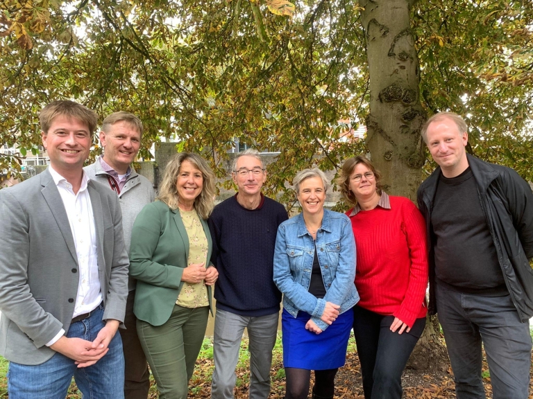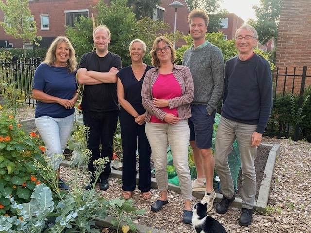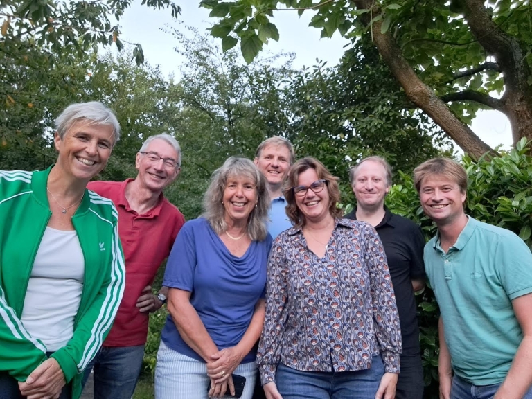 De fractie (Klaas was nog met vakantie) aan het begin van het politieke seizoen 2025/2026 in de tuin van Wyke (met een geïnteresseerde poes Flo :-)