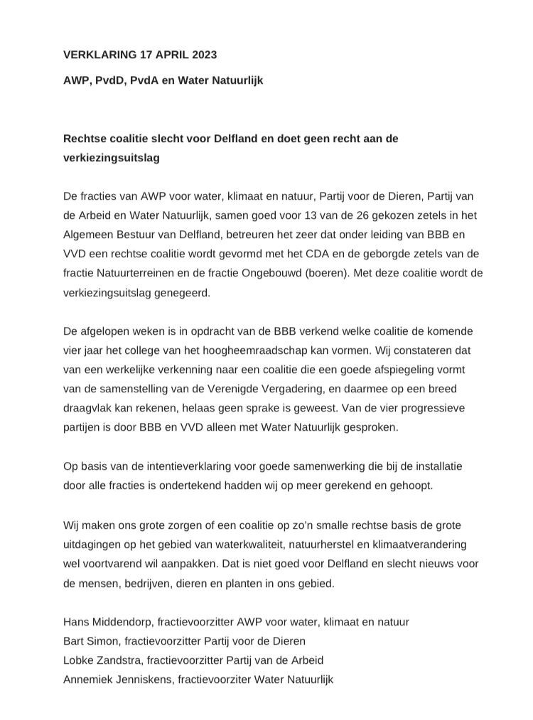 Vandaag, 1 juni 2023, hebben de vier progressieve partijen: WaterNatuurlijk, PvdA, PvdD en AWP voor water, klimaat en natuur een motie van afkeuring ingediend in de eerste vergadering met het nieuwe college van het waterschap Delfland. De vier progressieve partijen zijn absoluut niet te spreken over het formatieproces. Daarbij zijn de progressieve partijen vanaf het begin buitengesloten. Dat heeft geleid tot een college dat absoluut geen afspiegeling is van de Verenigde Vergadering. Het coalitieakkoord van dit college toont erg weinig ambitie. Het heeft een beperkte, technische focus op het takenpakket van het waterschap terwijl maatschappelijke thema’s als klimaatverandering, waternatuur en biodiversiteit juist veel meer aandacht nodig hebben. Ook blinkt het coalitieakkoord uit in vaagtaal over de resultaten die ze wil bereiken, en vooral hoe deze resultaten moeten worden betaald.