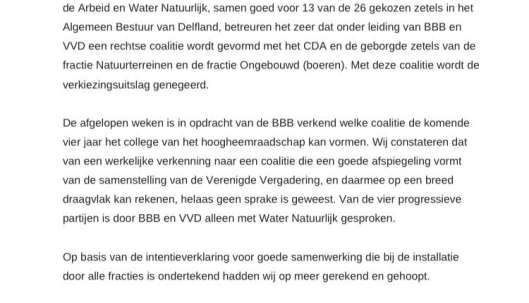 Vandaag, 1 juni 2023, hebben de vier progressieve partijen: WaterNatuurlijk, PvdA, PvdD en AWP voor water, klimaat en natuur een motie van afkeuring ingediend in de eerste vergadering met het nieuwe college van het waterschap Delfland. De vier progressieve partijen zijn absoluut niet te spreken over het formatieproces. Daarbij zijn de progressieve partijen vanaf het begin buitengesloten. Dat heeft geleid tot een college dat absoluut geen afspiegeling is van de Verenigde Vergadering. Het coalitieakkoord van dit college toont erg weinig ambitie. Het heeft een beperkte, technische focus op het takenpakket van het waterschap terwijl maatschappelijke thema’s als klimaatverandering, waternatuur en biodiversiteit juist veel meer aandacht nodig hebben. Ook blinkt het coalitieakkoord uit in vaagtaal over de resultaten die ze wil bereiken, en vooral hoe deze resultaten moeten worden betaald.