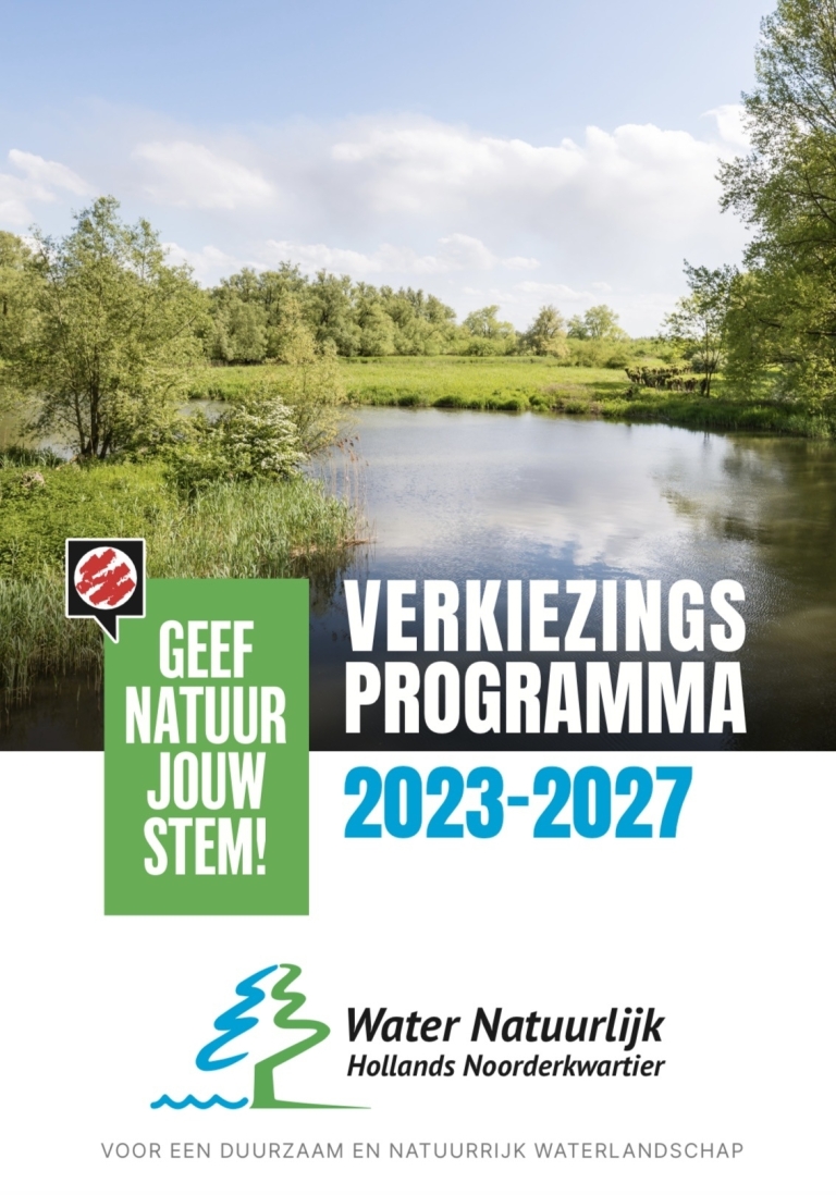 Met deze slogan gaat Water Natuurlijk de Waterschapsverkiezingen in. Op 15 maart stemt u niet alleen voor de Provinciale Staten maar ook voor de waterschappen. Het werk van waterschappen wordt met de dag belangrijker door de verandering van ons klimaat. Water Natuurlijk geeft een stem aan dat wat kwetsbaar is. In het werkgebied van het Hoogheemraadschap Hollands Noorderkwartier zijn wij de enige, echte duurzame waterschapspartij. Wij beschermen en verbeteren de natuur en het landschap en geven ruimte aan waterrecreatie met respect voor de kwetsbare natuur.