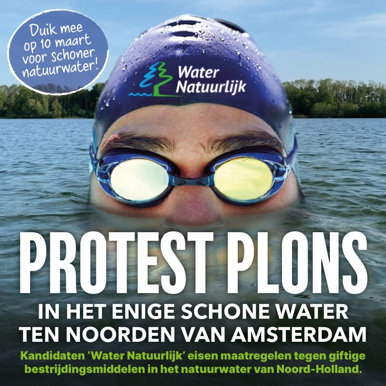 Kandidaten van de grootste Waterschapspartij in Nederland doken vanmorgen in het enige schone water van het waterschap HHNK. Met deze duik willen ze laten zien hoe ongerust ze zijn over de waterkwaliteit in Noord-Holland boven Amsterdam. De norm voor bestrijdingsmiddelen wordt in al het oppervlaktewater en grondwater fors overschreden. ”Door het gebruik van bestrijdingsmiddelen vermindert de biodiversiteit wat direct invloed heeft op onze leefomgeving en gezondheid, dat is onze grote zorg” gaf lijsttrekker Saskia Borgers aan.