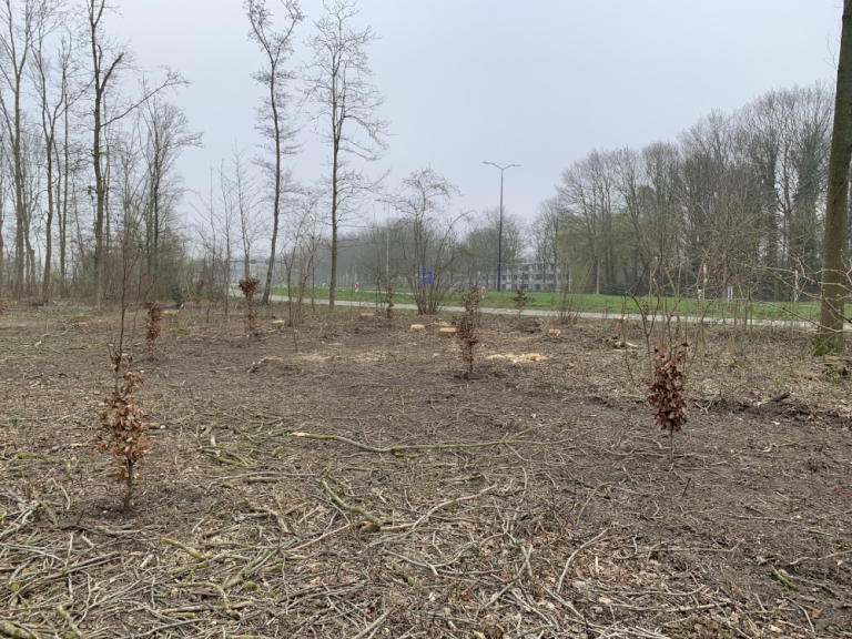 Het leek erop dat de oogst van hout ook een reden was. Hout brengt geld op en alle stammen en dikke takken zijn afgevoerd en het dunne hout is versnipperd en ook afgevoerd. Er is geen snipper achter gebleven. Voor het belang van de natuur was het goed geweest om dood hout achter te laten. Dood hout leeft. Allerlei paddenstoelen en dieren zijn daarvan afhankelijk. Op de kapvlaktes zijn ongeveer 65 beuken en wat hulststruiken terug geplant. Allebei soorten die niet in de Hoeksche Waard thuishoren en weinig te betekenen hebben voor biodiversiteit.