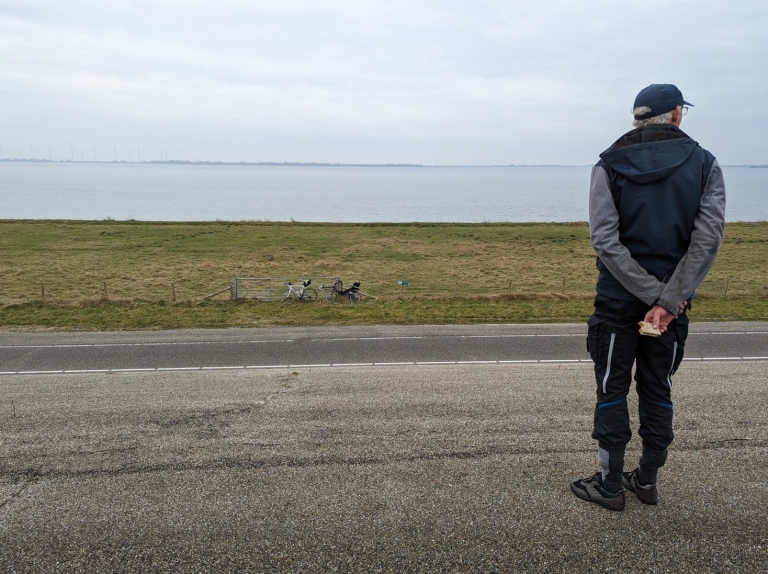 Samen met Servaas-op-ligfiets vlieg ik langs de mooie Slikken van Flakkee. Hier is ruimte voor water en natuur. We zien rotganzen, brandganzen, een roodborsttapuit en reeën. En Rinus Kik, die in Water Natuurlijk-jas en -muts meedoet aan de lokale snertwandeling en zijn groep heeft verlaten voor een ontmoeting met ons.