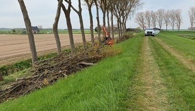 Het snoeien van bomen aan de buitendijk bij Sommelsdijk ging in de broedtijd gewoon door. In een hoogwerker zaagde een man met een kettingzaag zware takken af. Die kwamen onder de boom in de slootkant en de sloot terecht. Met een kraan zette men de takken op een hoop voor de snippermachine. Het gevolg was verstoring van nesten in de bomen en nesten, op de grond, waar de takken vielen waren zeker kansloos.