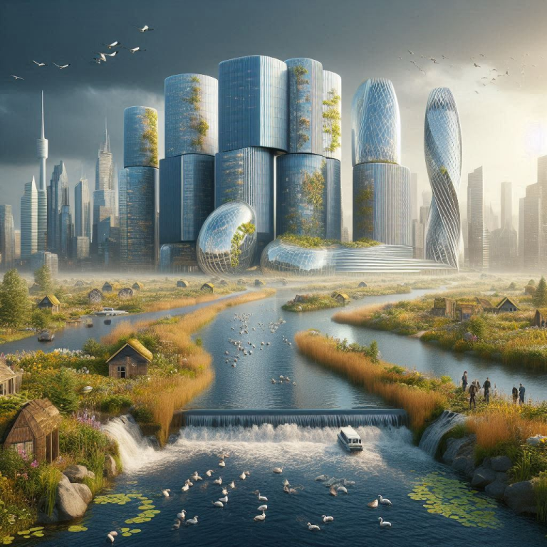 (AI afbeelding hierboven: Nederland over 25 jaar met het lage klimaatscenario en heel veel biodiversiteit)