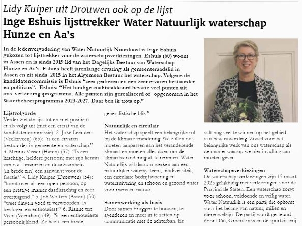 Week in Week uit (een weekblad met verzorgingsgebied gemeente Borger Odoorn en gemeente Aa en Hunze) besteedt aandacht aan de kandidatenlijst van Water Natuurlijk voor waterschap Hunze en Aa's i.v.m. de waterschapsverkiezingen in maart 2023.
