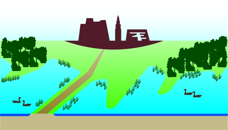 De steden en de dorpen zijn oorspronkelijk gebouwd op hogere gronden, zo hield men droge voeten. Later zijn ook lage gebieden bebouwd. Omdat veel oppervlak verhard is, kan het water niet goed de grond in wat leidt tot wateroverlast. Doordat verharding snel opwarmt, kan het in steden tot wel 10 °C warmer zijn dan in de omgeving. Water werkt verkoelend en het is belangrijk voor de natuur in steden en dorpen. In de Groninger singels zwemt soms een otter: de binnenstad is via het water verbonden met de natuur rondom de stad.