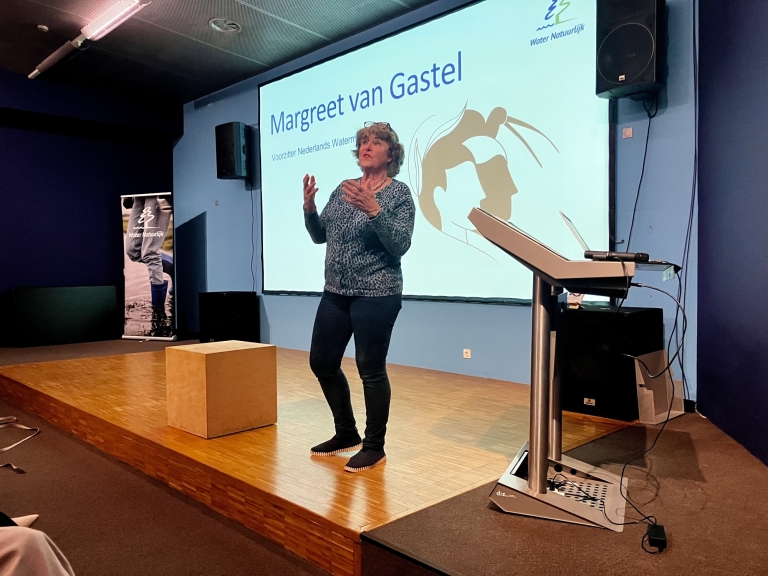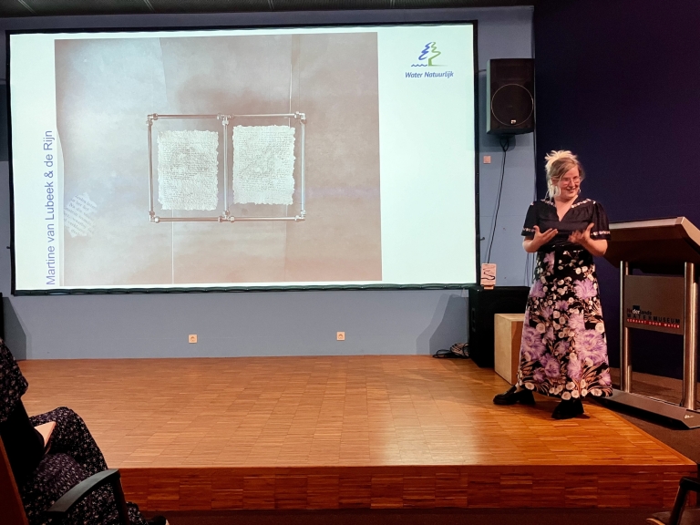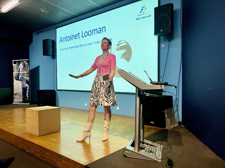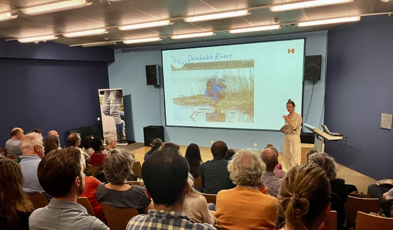 Hoe krijgen we onze rivieren weer drinkbaar? Die vraag stond 2 mei centraal tijdens een publieksbijeenkomst in het Nederlands Watermuseum. De vraag werd ingeleid door Margreet van Gastel, voorzitter van het Nederlands Watermuseum. Verder stonden artistiek onderzoeker Martine van Lubeek, waterverbinder Kirsten van Gorkum - van de Meeberg en rivierjournalist Wim Eikelboom op het programma. Antoinet Looman, Heemraad waterschap Rijn en IJssel Water Natuurlijk begeleide enthousiast de avond. En het water zelf, die liet ook van zich horen. Na een hete dag viel het plots met bakken uit de hemel. We werden letterlijk allemaal “geraakt” door water, precies zoals de slogan van het Nederlands Watermuseum uitdraagt: 'Geraakt door water!'.