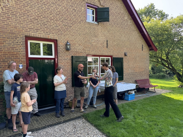 De wandeling werd afgesloten met een hartelijke ontvangst bij de gastvrije familie Middeldorp, waar we konden genieten van een verfrissende appeltap en wátermeloen. De familie Middeldorp woont sinds 1987 in Velp en de Beekhuizensebeek is een plek waar werd gespeeld, gewandeld en langs gefietst.