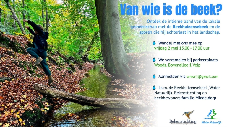 Graag nodigen we je uit voor een waterwandeling. Op vrijdagmiddag 2 mei 15:00- 17:00 uur wandelen we langs de Beekhuizensebeek. Deze sprengenbeek ontspringt op de Veluweflank in Velp. Eeuwenlang stroomt hij vanaf daar door het leven van diverse mensen. Elk van hen leert de beek op haar eigen manier kennen. Tijdens de wandeling ontdekken we sporen die de relatie van mensen met de beek hebben achtergelaten in het landschap. En maken we kennis met de familie Middeldorp, twee generaties beekbewoners. De organisatie is in handen van de Bekenstichting en Water Natuurlijk. Iedereen kan aansluiten.