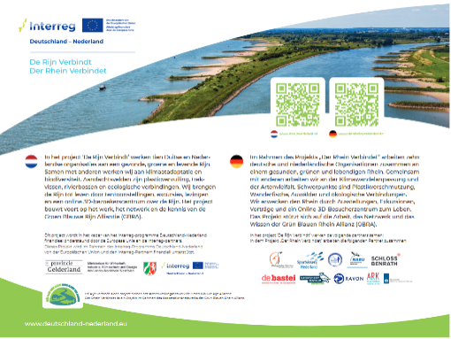 In het project ‘De Rijn Verbindt/Der Rhein Verbindet’ werken tien Duitse en Nederlandse organisaties samen aan een gezonde, groene en levende Rijn. Samen met anderen werken zij aan klimaatadaptatie en biodiversiteit. De uitvoering van het project gebeurt tussen 2023-2026.
