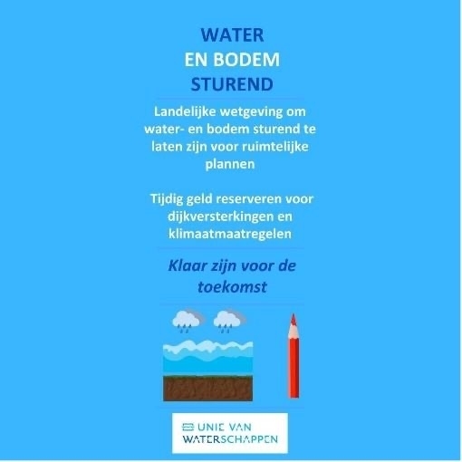 1. Waterschappen willen dat het rijk sneller dan 2025 met landelijke wetgeving komt voor de implementatie waarmee water en bodem sturend worden voor ruimtelijke plannen.