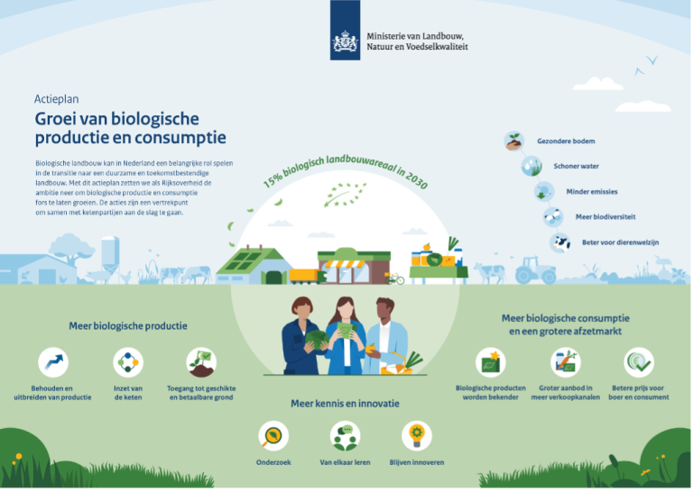Het kabinet wil met het Actieplan ‘Groei van biologische productie en consumptie’ naar 15 procent biologisch landbouwareaal in 2030. Ofwel een groei van 80.000 naar zo’n 300.000 hectare biologisch landbouwareaal. Om dat te realiseren gaat LNV samenwerken met de sector en ketenpartijen zodat de biologische productie en consumptie zal toenemen. De groei van biologisch is onderdeel van een versnelling naar een duurzamere voedselproductie. Haalbaar, volgens Bionext, echter alleen als iedereen - overheid, keten én consument - voor biologisch gaat. Voor de opstart van het actieplan is in 2023 en in 2024 € 26 miljoen beschikbaar uit het transitiefonds. Het actieplan is niet alleen gericht op groei van het biologisch landbouwareaal, maar op de hele keten. Naast boeren, spelen ook handel, toeleveranciers en supermarkten en kennisinstellingen een grote rol.