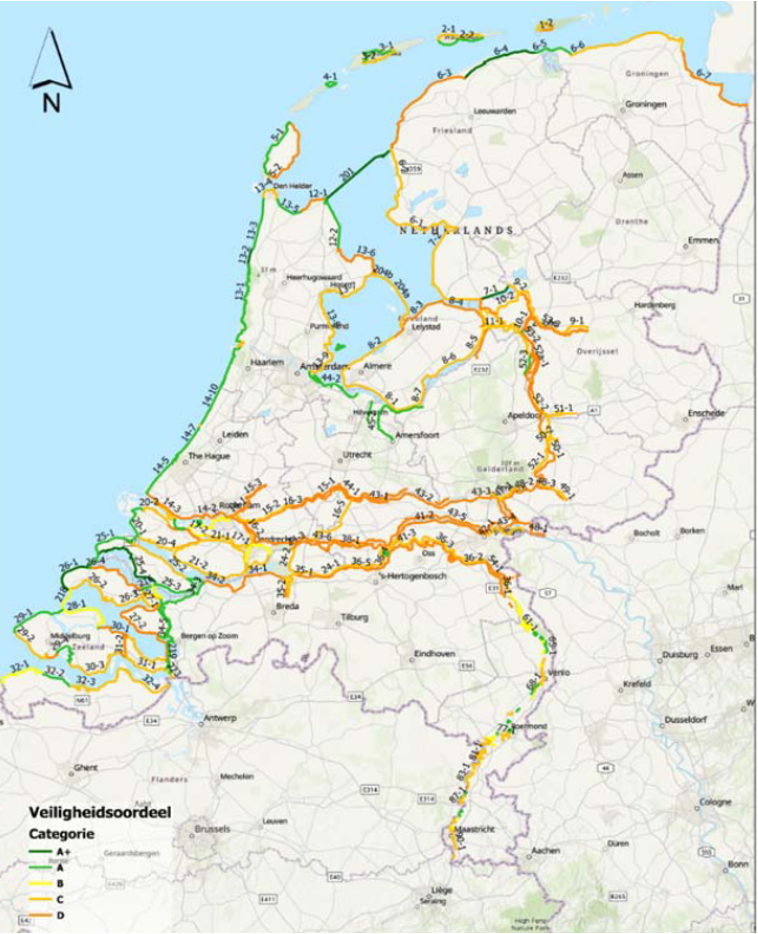 Sinds 2017 gelden er nieuwe, deels strengere normen voor de waterveiligheid waarbij rekening wordt gehouden met de kans op overstromingen, maar ook met wat we willen beschermen in termen van mensenlevens en toegenomen economische waarde. Ten opzichte van de normen vóór 2017 is het inwoneraantal van Nederland immers gegroeid, de economie veranderd en de kennis over de waterveiligheid vergroot. Van de 237 beoordeelde trajecten valt 26% in categorie D. Dat betekent dat deze trajecten ruim niet voldoen aan de (strenge) norm en dat daarvoor verbetermaatregelen nodig zijn. 36% valt in categorie C en daarvoor geldt dat deze trajecten ook aangepakt moeten worden. Voor de 10% in categorie B geldt dat daar meer tijd is voor de benodigde verbetering en voor de 28% van de trajecten die vallen in categorie A+ en A geldt dat deze voldoen aan de normen. Belangrijk hierbij is dat per dijktraject één veiligheidsoordeel geldt. Dat betekent dat het zwakste punt of een combinatie van zwakke punten in dat traject bepalend is voor het oordeel van het hele traject. Meestal hoeft niet het hele traject te worden aangepakt maar slechts een deel of delen.