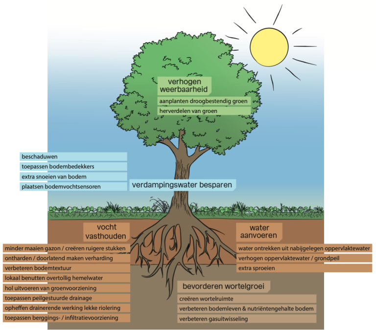 Voor de droge gebieden zoekt Amersfoort naar manieren om regenwater langer vast te kunnen houden. Dit kan bij groeiplaatsen door organisch stof aan de bodem toe te voegen, maar ook door ondergrondse reservoirs aan te leggen die het vocht gedoseerd aan de bodem teruggeven. Dat laatste is nog niet zo eenvoudig, zowel qua techniek als qua bodembeslag.