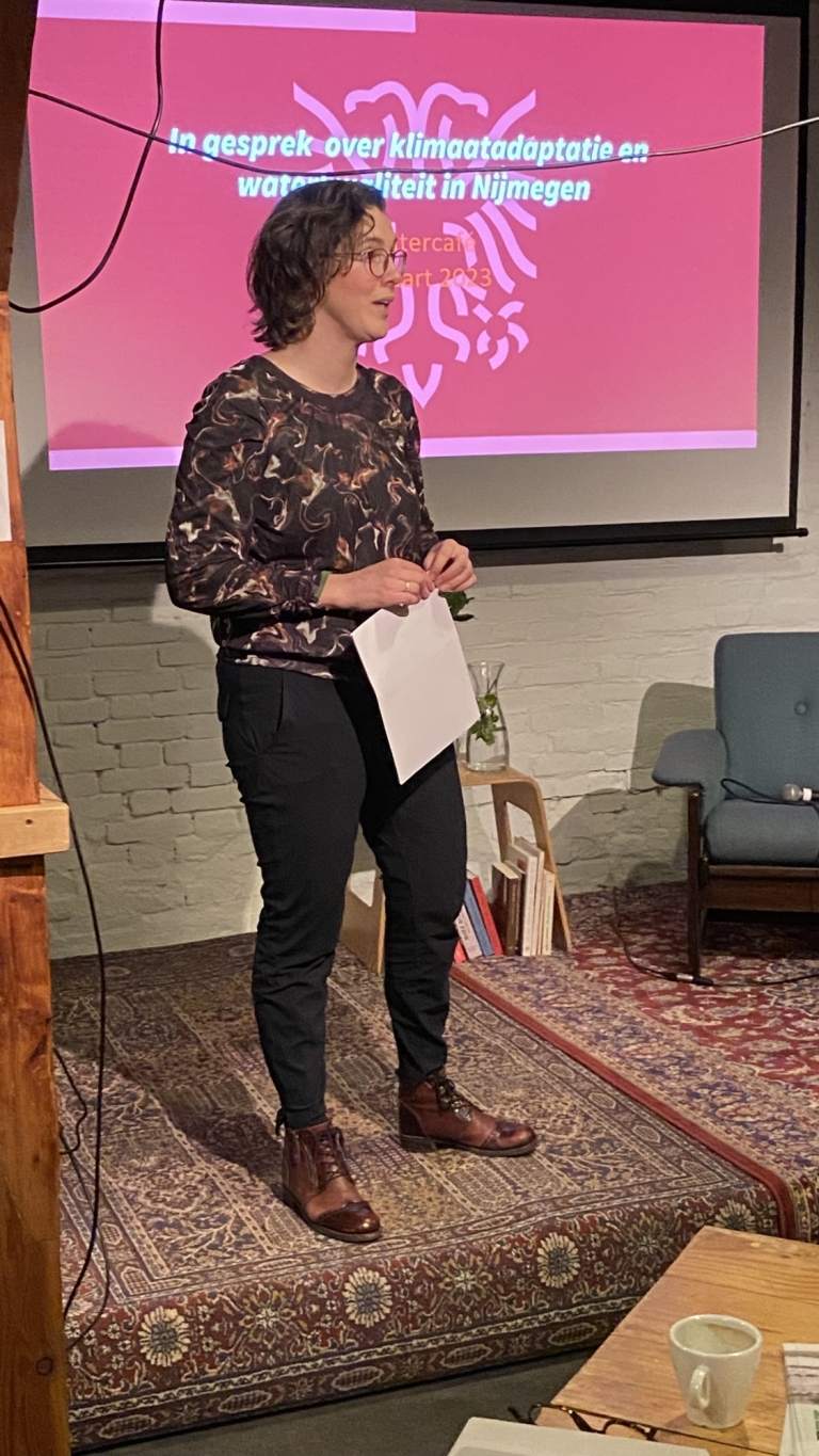 Cilia Daemen, wethouder van de gemeente Nijmegen, geeft een presentatie over wat de gemeente Nijmegen, samen met buurgemeenten en het waterschap, doet aan klimaatadaptatie. Welke maatregelen neemt de gemeente tegen hittestress, wateroverlast én droogte? Kunnen we daarmee onze regio klimaatbestendig houden? Cilia Daemen gaat ook in op wat je zelf kan doen aan klimaatadaptatie. Met het afkoppelen van waterpijpen kan overbelasting van het riool worden voorkomen. Met de operatie Steenbreek worden burgers geholpen om hun tuinen te ontstenen. Zo kan water in de bodem worden opgenomen.