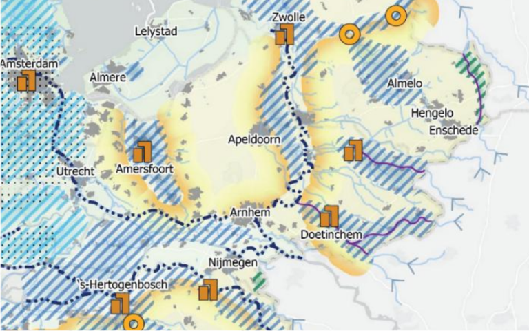 Op sommige plekken kunnen zich grote waterdieptes vormen, soms wel 1 tot 2 meter, vooral in hellend terrein, langs beken en in overgangszones van hoog naar laag Nederland. In gebieden die afhankelijk zijn van bemaling kan het water dagen tot weken blijven staan. Daarnaast zijn er plekken waar tijdelijke snelstroming of een verhoogde kans op kadebreuken extra risico’s met zich meebrengen. In de waterschappen Rivierenland, Rijn en IJssel en Vallei en Veluwe zijn vooral bebouwde gebieden bijzonder kwetsbaar langs krappe waterlopen waarvan de afvoercapaciteit onvoldoende is bij dit soort extreme regengebeurtenissen. Het gaat dan om Doetinchem langs de Oude IJssel, Lochem langs de Berkel, Amersfoort aan het Valleikanaal, en om de IJsselvallei. De schade kan oplopen tot honderden miljoenen euro’s, met risico’s voor vitale infrastructuur en de veiligheid van inwoners.