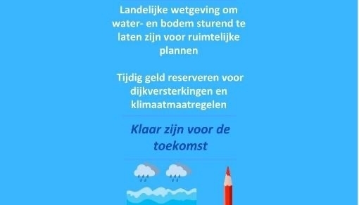 De Unie van Waterschappen heeft de belangrijkste stand-punten van de waterschappen aangeleverd bij de commissies van de politieke partijen die de verkiezingsprogramma’s schrijven voor de Tweede Kamerverkiezingen. Water en bodem staan in Nederland onder druk en op veel plekken zijn de grenzen bereikt. De droogte, extreme hoosbuien, bodemdaling en zeespiegelstijging zorgen ervoor dat veilig wonen en werken niet langer vanzelfsprekend zijn in Nederland. Ook de kwaliteit en de beschikbaarheid van water staan onder grote druk. Dit betekent dat we concrete maatregelen om overlast en schade voor onszelf en voor toekomstige generaties te beperken niet langer kunnen uitstellen. De waterschappen pleiten daarom voor landelijke wetgeving voor een leidende rol van water en bodem in ruimtelijke plannen en voor het voorkomen van lozingen van schadelijke stoffen in het water door de industrie.