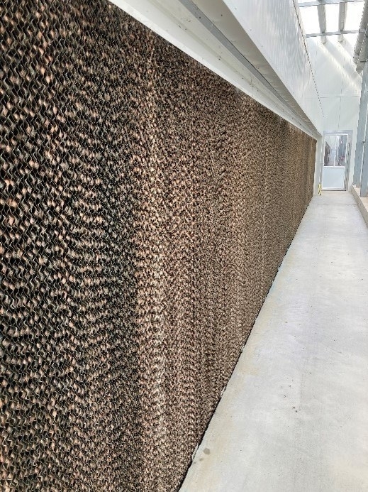 Het meest verrast worden we in de klimaatkamer, waar de juiste omstandigheden worden gecreëerd die vervolgens de kas in worden geblazen. Alles met als doel om een gemiddelde etmaal temperatuur te creëren van 21° C bij de planten. Als de zon zich nadrukkelijker laat zien gaan de gordijnen in de kas wat meer dicht en wordt er natte koele lucht onder de planten geblazen. De lucht wordt gekoeld door het langs bevochtigd karton te laten waaien. Het is een soort radiator, maar dan wel een die veel groter is dan in de gemiddelde auto. Boven in de kas gaat automatisch een raam open waardoor de te warm geworden lucht ontsnapt. “Het verbruik ligt nu al 30% lager dan in de oude kas en als we het proces verder weten te optimaliseren moeten we wel tussen de 50% a 60% energie kunnen besparen”, geeft Hans aan.