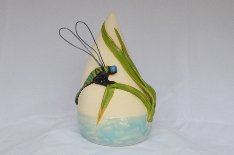 Het kunstwerk toont een blauwgroene libel die de schoonheid en kwetsbaarheid van de natuur in en om ons water symboliseert. Zoekend, elegant en kritisch verkent de libel onze wateren zoals ook Water Natuurlijk dat doet en wil blijven doen.