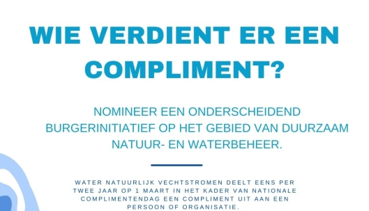 Water Natuurlijk Vechtstromen deelt eens per twee jaar op Nationale complimentendag een compliment uit aan een persoon of organisatie. Hiermee wil Water Natuurlijk Vechtstromen aandacht en waardering schenken aan een onderscheidend burgerinitiatief op het gebied van duurzaam natuur- en waterbeheer.